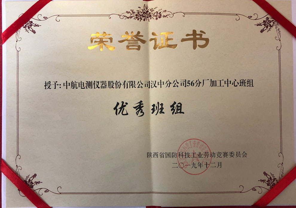 2019年12月19日,在陜西省國防工會班組建設(shè)推進會上,漢中分公司56分廠加工中心班組被陜西省國防科技工業(yè)勞動競賽委員會授予“優(yōu)秀班組”榮譽稱號。